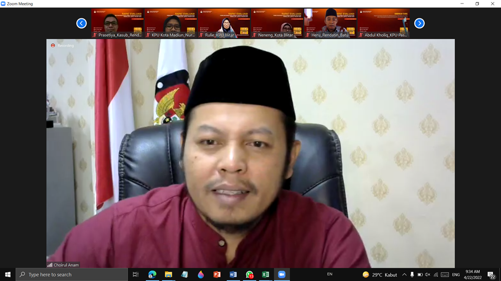 Pasuruan, kab-pasuruan.kpu.go.id - Jumat (22-04-2022), dalam rangka Pemutakhiran Data Pemilih Berkelanjutan (DPB) Tahun 2022, Komisi Pemilihan Umum (KPU) Provinsi Jawa Timur mengadakan kegiatan evaluasi DPB Triwulan I Tahun 2022, yang diikuti Divisi Perencanaan, Data dan Informasi, Kasubag Perencanaan, Data dan Informasi, serta Operator Sidalih secara daring (dalam jaringan) melalui zoom meeting.