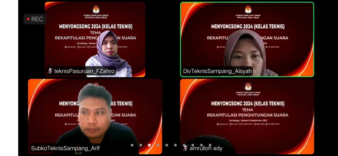 KPU Kabupaten Pasuruan secara virtual aktif mengikuti setiap sesi ruang diskusi kelas teknis, antara lain Fatimatuz Zahro (Divisi Teknis Penyelenggaraan KPU Kabupaten Pasuruan), dan Adi Setyawan (Plt. Kasubag Teknis dan Hupmas KPU Kabupaten Pasuruan), serta Dwi Widoyoko (staf teknis dan hupmas) mengikuti kegiatan hingga usai pada pukul 13.10 WIB.