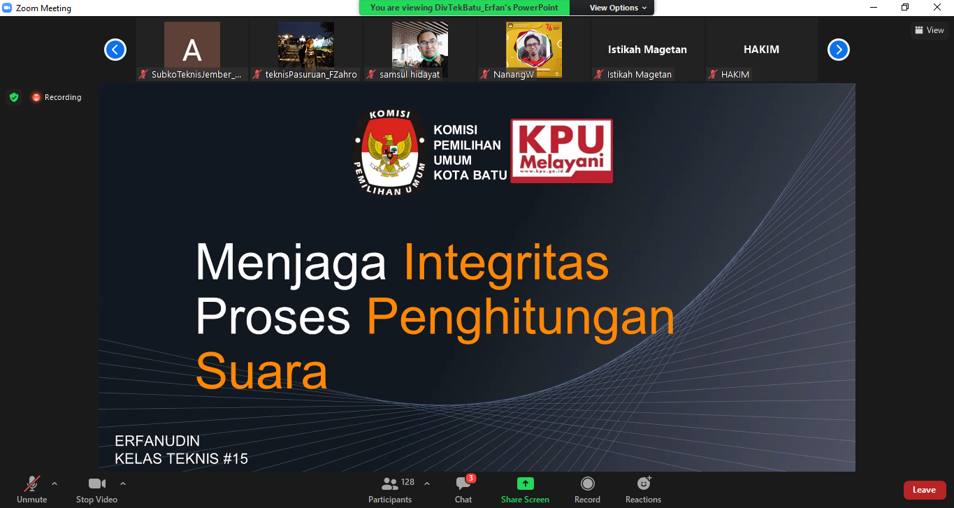 Pasuruan, kab-pasuruan.kpu.go.id – Kamis (09/09/2021) ruang diskusi Kelas Teknis secara virtual yang diselenggarakan Komisi Pemilihan Umum (KPU) Provinsi Jawa Timur, memasuki pertemuan kelima belas. Adapun tema yang dikupas yaitu terkait Penghitungan Suara Pemilu Edisi Kedua. Peserta dalam kelas teknis adalah Divisi Teknis Penyelenggara, Sub Koordinator Teknis, dan divisi lain dari Kabupaten/Kota se- Jawa Timur.