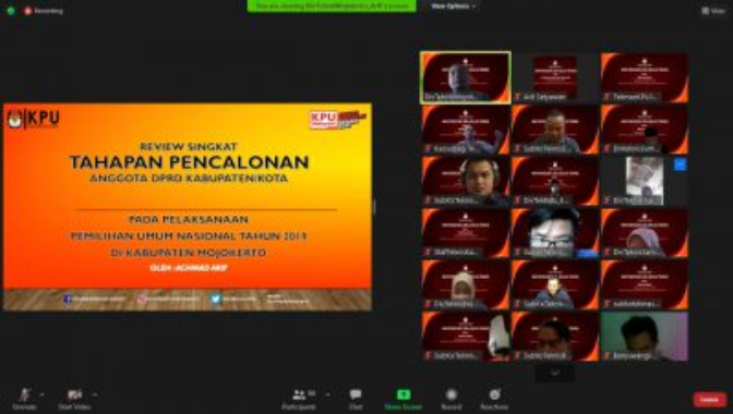 Pasuruan, kab-pasuruan.kpu.go.id – Selasa (27/07/2021) Komisi Pemilihan Umum (KPU) Provinsi Jawa Timur untuk kali ketiga, menggelar ruang diskusi secara virtual di bulan Juli dengan mengambil tema Pencalonan. Acara yang diikuti oleh Divisi Teknis Penyelenggara dan Sub Koordinator Teknis dan Hupmas KPU Provinsi Jawa Timur dan KPU Kabupaten/Kota se - Jawa Timur. Hadir sebagai peserta kegiatan tersebut, Divisi Teknis Penyelenggaraan KPU Kabupaten Pasuruan, Fatimatuz Zahro dan Plt. Kasubag Teknis dan Hupmas, Adi Setyawan.