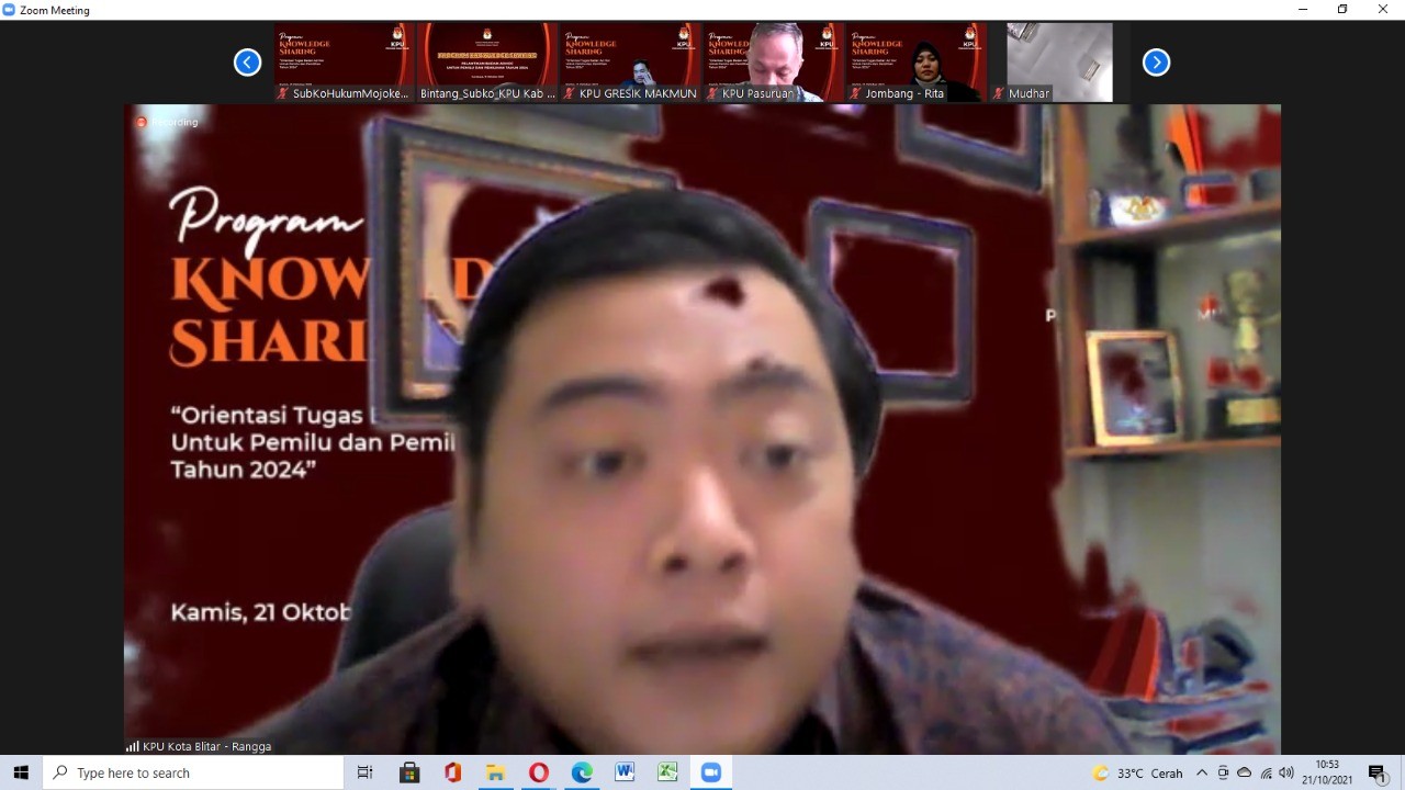 Pasuruan, kab-pasuruan.kpu.go.id – Setelah resmi dilantik dan dikukuhkan menjadi badan penyelanggara adhoc, tahap selanjutnya adalah orientasi tugas. Tahap ini merupakan proses pengenalan visi dan misi organisasi, lingkungan serta tata kerja badan adhoc sehingga nantinya dapat tercipta harmoni dalam bekerja. Tema ‘orientasi tugas’ inilah yang diusung oleh KPU Provinsi Jawa Timur dalam Program Knowledge Sharing Pembentukan Badan Adhoc Untuk Pemilu dan Pemilihan Tahun 2024 edisi ke-14 hari ini (21/10/2021).