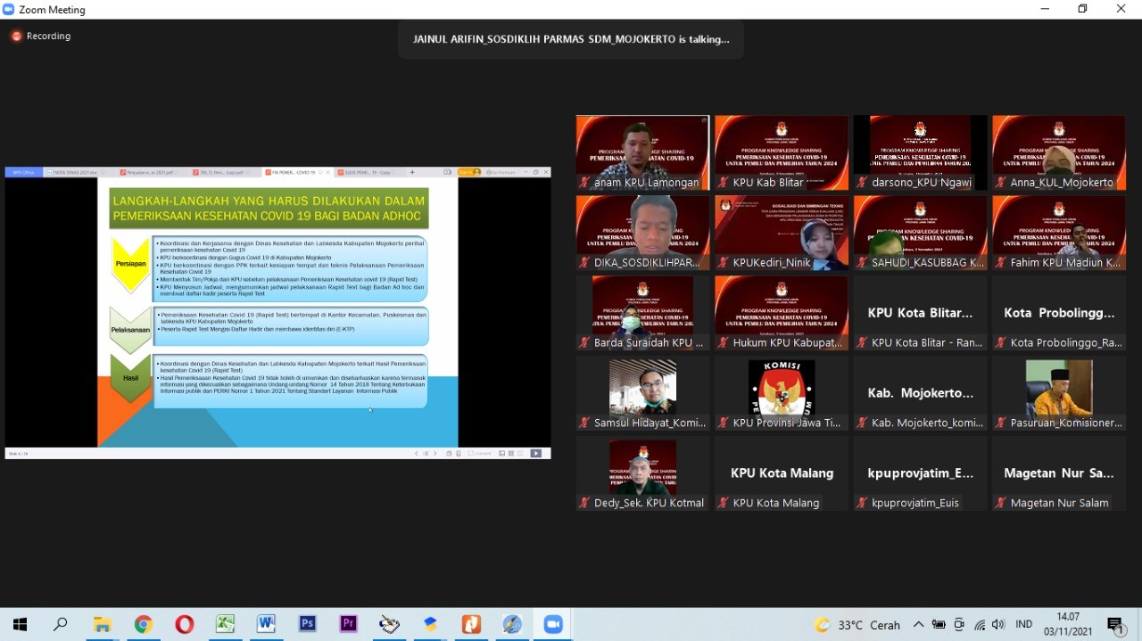 Pasuruan, kab-pasuruan.kpu.go.id – KPU Provinsi Jawa Timur bersama dengan KPU Kabupaten/Kota se-Jawa Timur, hari ini (03/11/2021) menggelar Program Knowledge Sharing dengan tema Pemeriksaan Kesehatan Covid-19 Badan Adhoc Untuk Pemilu dan Pemilihan Tahun 2024 secara daring. Memasuki edisi ke-17 kali ini, berkesempatan menjadi narasumber Divisi Sosdiklih, Parmas dan SDM KPU Kota Malang, Muhammad Toyib dan pembahas Divisi Sosdiklih, Parmas dan SDM KPU Kabupaten Mojokerto, Jainul Arifin.