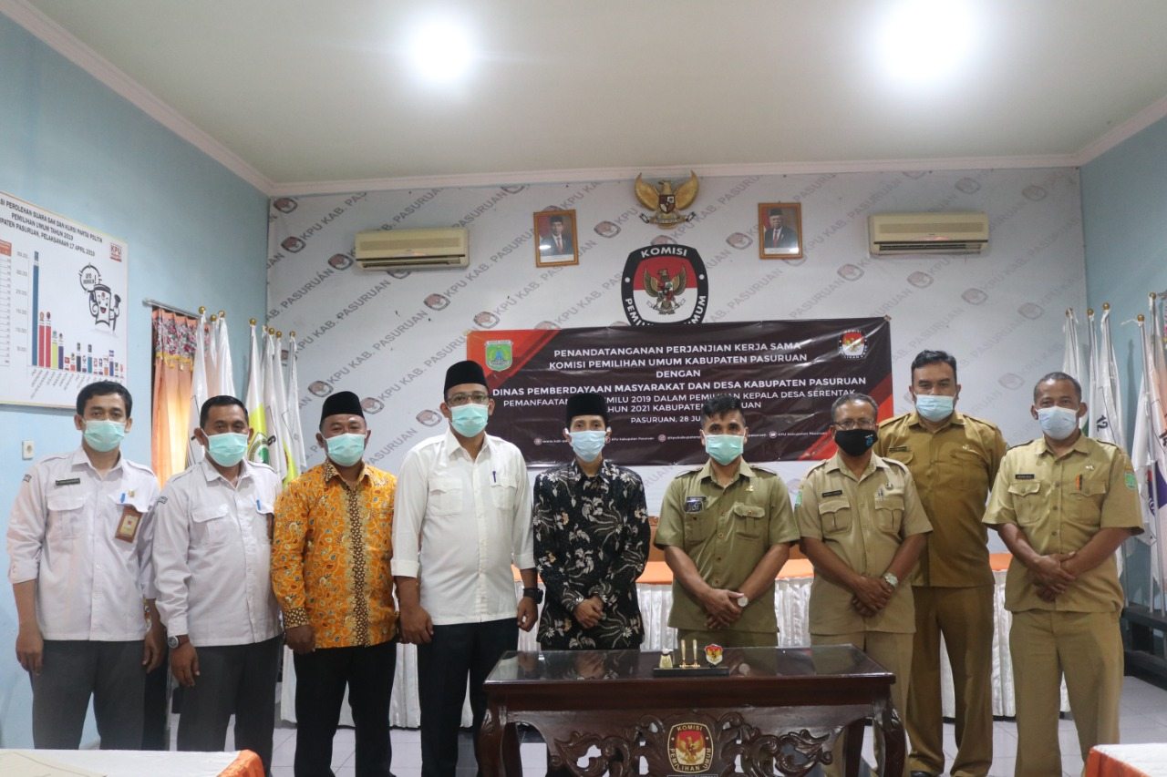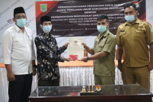 Pasuruan - Senin (28/06/2021) bertempat di ruang serbaguna Kantor KPU Kabupaten Pasuruan, Jl. Sudarsono No. 01 Pogar Bangil, Kepala Dinas Pemberdayaan Masyarakat dan Desa (DPMD) Kabupaten Pasuruan menandatangani Perjanjian Kerja Sama (PKS) dengan Ketua KPU Kabupaten Pasuruan terkait Pemanfaatan DPT pemilu 2019 dalam penyelenggaraan Pemilihan Kepala Desa Serentak Tahun 2021 di Kabupaten Pasuruan.