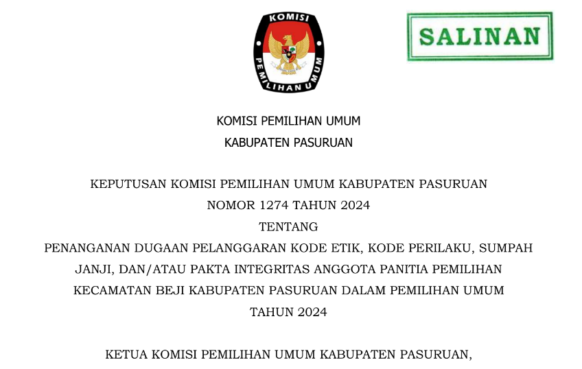 PENANGANAN DUGAAN PELANGGARAN KODE ETIK, KODE PERILAKU, SUMPAH JANJI, DAN/ATAU PAKTA INTEGRITAS ANGGOTA PANITIA PEMILIHAN KECAMATAN BEJI KABUPATEN PASURUAN DALAM PEMILIHAN UMUM TAHUN 2024