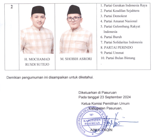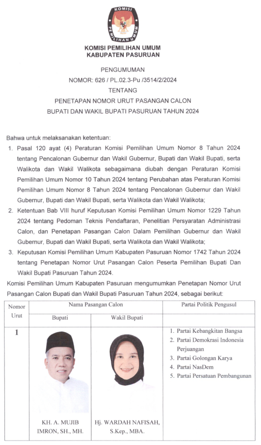 PENETAPAN NOMOR URUT PASANGAN CALON BUPATI DAN WAKIL BUPATI PASURUAN TAHUN 2024