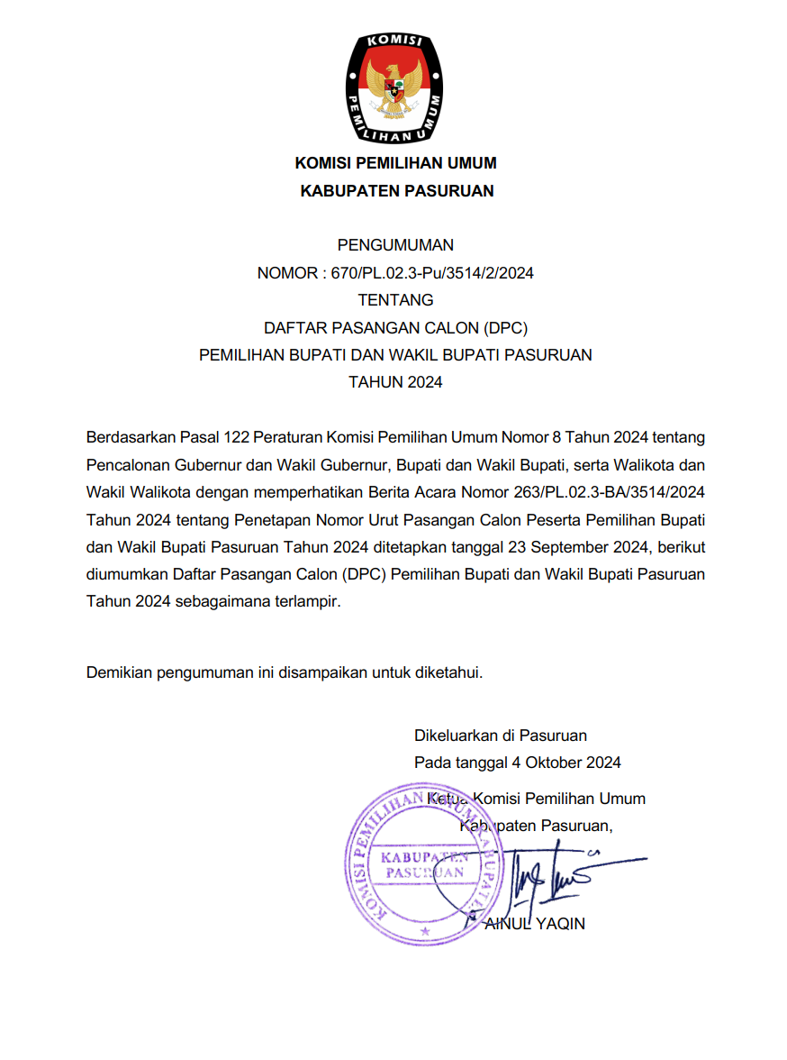 PENGUMUMAN DAFTAR PASANGAN CALON (DPC) PEMILIHAN BUPATI DAN WAKIL BUPATI PASURUAN TAHUN 2024