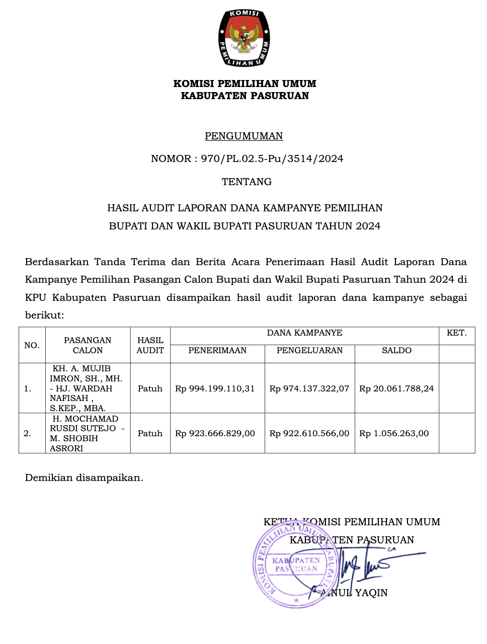 PENGUMUMAN HASIL AUDIT LAPORAN DANA KAMPANYE PEMILIHAN BUPATI DAN WAKIL BUPATI PASURUAN TAHUN 2024