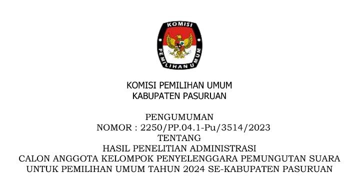 Pengumuman Hasil Penelitian Administrasi Calon Anggota KPPS Pemilu Tahun 2024 se-Kabupaten Pasuruan