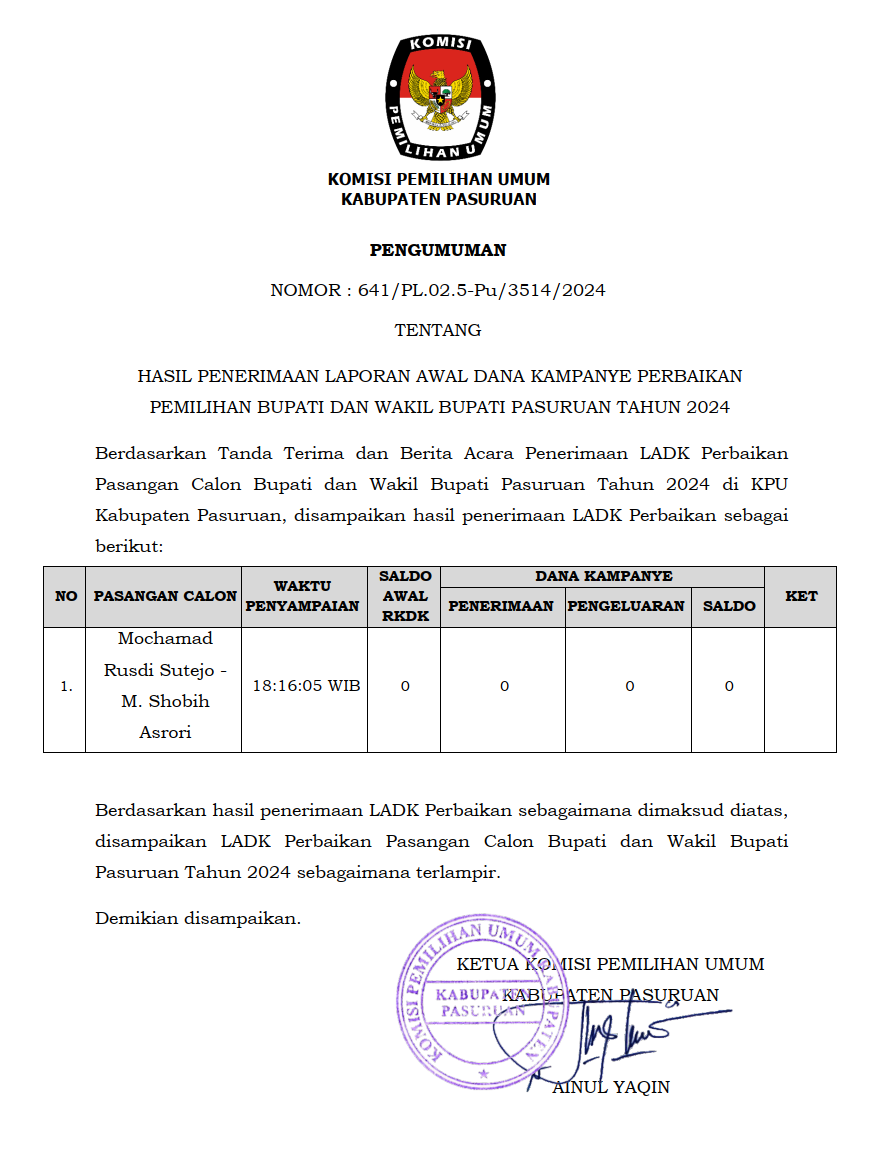 PENGUMUMAN HASIL PENERIMAAN LAPORAN AWAL DANA KAMPANYE PERBAIKAN PEMILIHAN BUPATI DAN WAKIL BUPATI PASURUAN TAHUN 2024