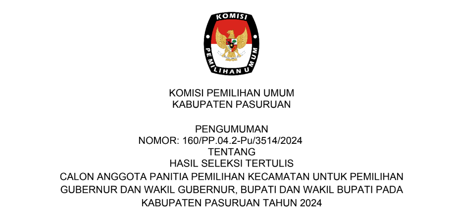 PENGUMUMAN HASIL SELEKSI TERTULIS CALON ANGGOTA PANITIA PEMILIHAN KECAMATAN UNTUK PEMILIHAN GUBERNUR DAN WAKIL GUBERNUR, BUPATI DAN WAKIL BUPATI PADA KABUPATEN PASURUAN TAHUN 2024