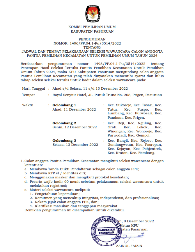 Berikut Pengumuman tentang Jadwal dan Tempat Seleksi Wawancara Calon Anggota PPK untuk Pemilu Tahun 2024 sesuai Pengumuman KPU Kabupaten Pasuruan Nomor: 1496/PP.04.1-Pu/3514/2022 Tanggal 9 Desember 2022: