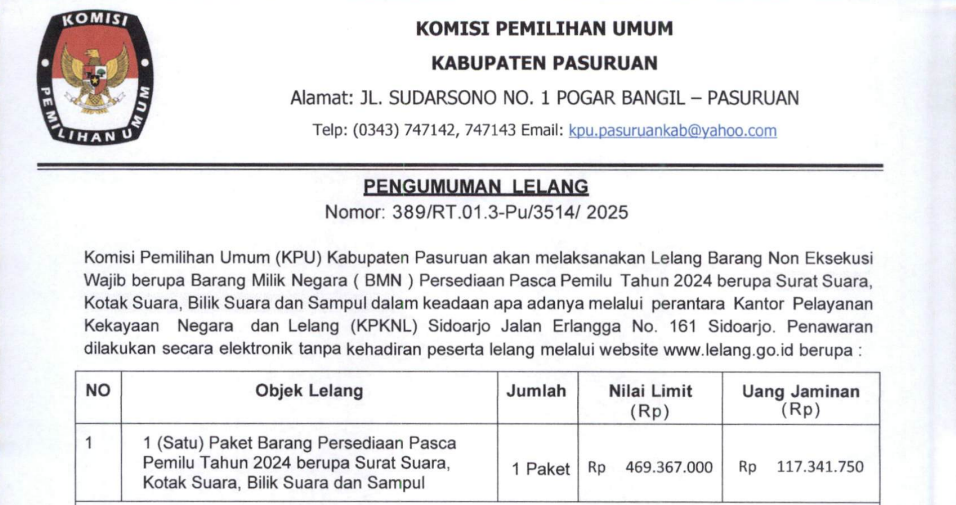 Komisi Pemilihan Umum (KPU) Kabupaten Pasuruan akan melaksanakan Lelang Barang Nono Eksekusi Wajib berupa Barang Milik Negara (BMN) Persediaan Pasca Pemilu Tahun 2024 berupa Surat Suara, Kotak Suara, Bilik SUara dan Sampul dalam keadaan apa adanya melakui perantara Kantor Pelananan Kekayanan Nnegara dan Lelang (KPKNL) Sidoarjo. Penawaran dilakukan secara elektronik tanpa kehadiran peserta leleng melalui website www.lelang.go.id