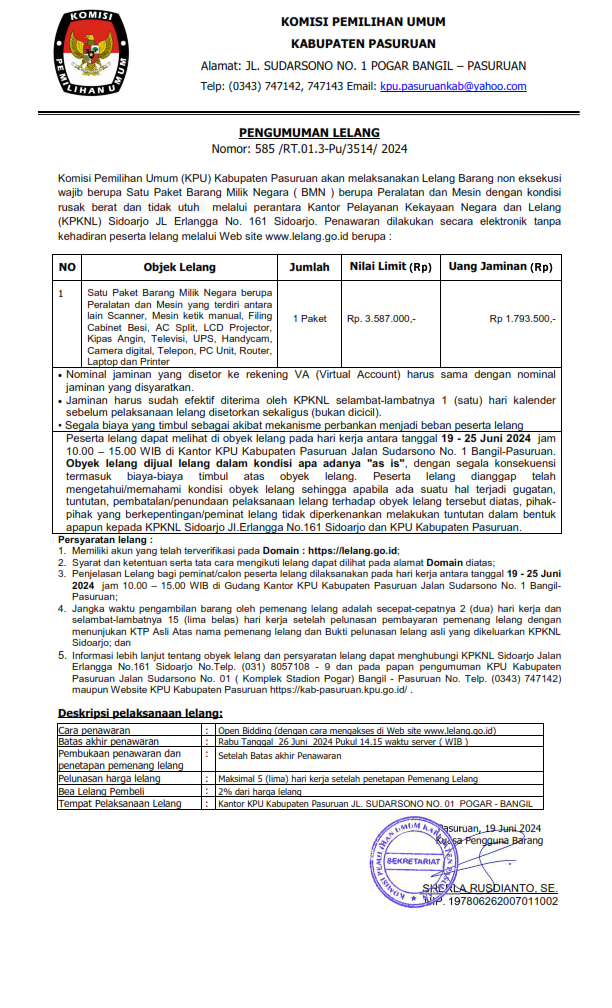 PENGUMUMAN LELANG BMN BERUPA INVENTARIS KANTOR