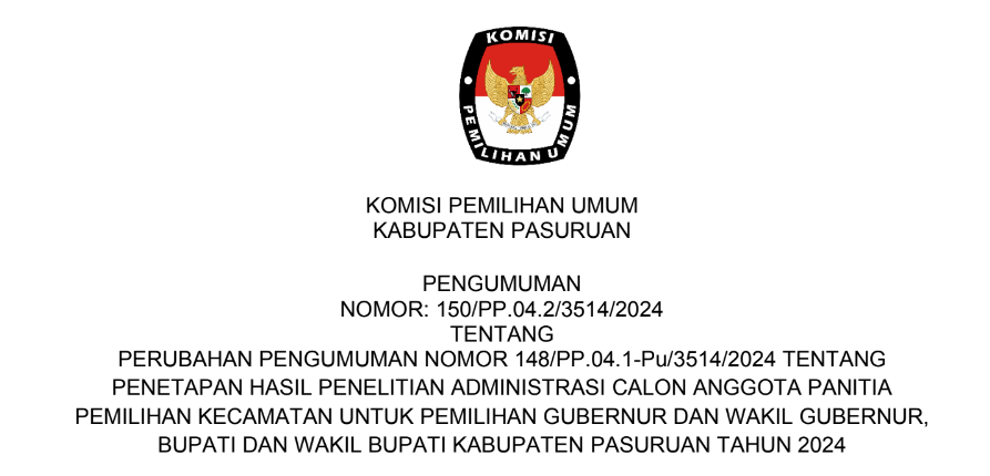 Pengumuman Nomor 150/PP.04.2/3514/2024 tentang Perubahan Pengumuman Nomor 148/PP.04.1-Pu/3514/2024 tentang Penetapan Hasil Penelitian Administrasi Calon Anggota Panitia Pemilihan Kecamatan (PPK) untuk Pemilihan Gubernur dan Wakil Gubernur, Bupati dan Wakil Bupati Kabupaten Pasuruan Tahun 2024