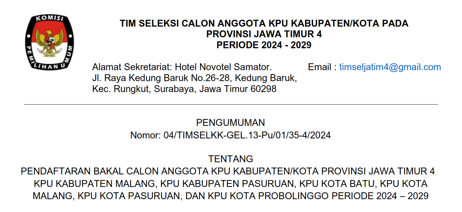 PENGUMUMAN PENDAFTARAN BAKAL CALON ANGGOTA KPU KABUPATEN/KOTA PROVINSI JAWA TIMUR 4 KPU KABUPATEN MALANG, KPU KABUPATEN PASURUAN, KPU KOTA BATU, KPU KOTA MALANG, KPU KOTA PASURUAN DAN KPU KOTA PROBOLINGGO PERIODE 2024 - 2029.