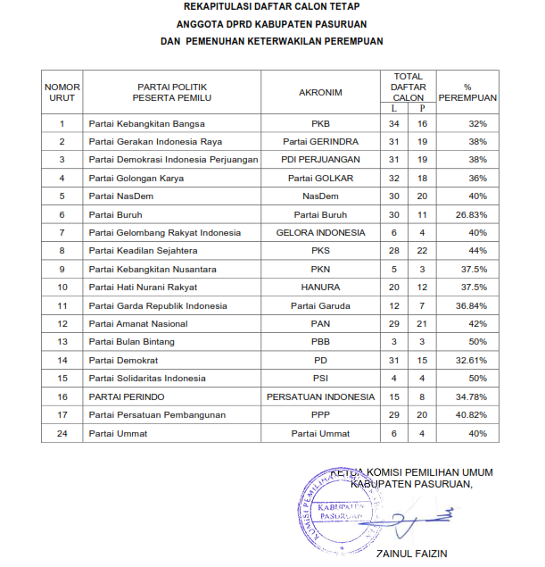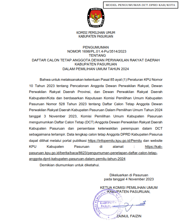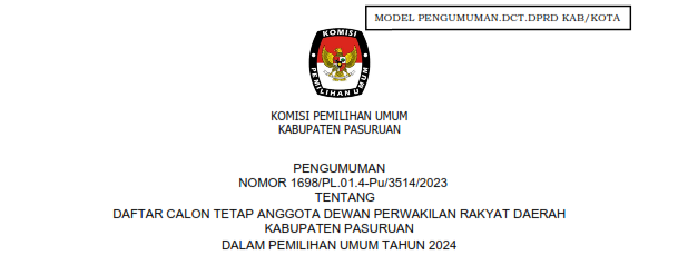 Pengumuman Penetapan Daftar Calon Tetap Anggota DPRD Kabupaten Pasuruan Dalam Pemilu Tahun 2024