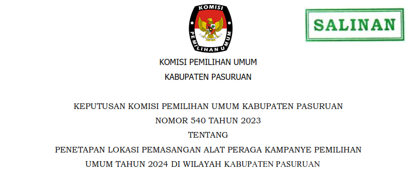 TENTANG PENETAPAN LOKASI PEMASANGAN ALAT PERAGA KAMPANYE PEMILIHAN UMUM TAHUN 2024 DI WILAYAH KABUPATEN PASURUAN