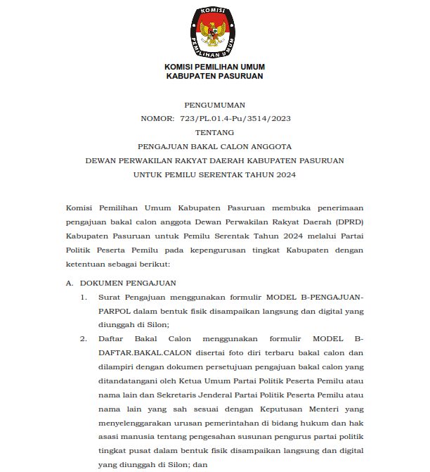 PENGUMUMAN PENGAJUAN BAKAL CALON ANGGOTA DEWAN PERWAKILAN RAKYAT DAERAH KABUPATEN PASURUAN UNTUK PEMILU SERENTAK TAHUN 2024