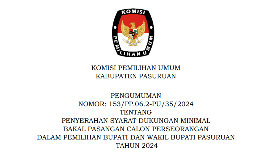 PENGUMUMAN NOMOR: 153/PP.06.2-PU/35/2024 TENTANG PENYERAHAN SYARAT DUKUNGAN MINIMAL BAKAL PASANGAN CALON PERSEORANGAN DALAM PEMILIHAN BUPATI DAN WAKIL BUPATI PASURUAN TAHUN 2024