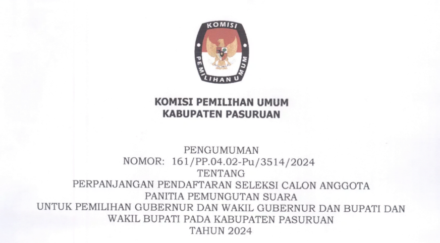 PENGUMUMAN PERPANJANGAN PENDAFTARAN SELEKSI CALON ANGGOTA PANITIA PEMUNGUTAN SUARA UNTUK PEMILIHAN GUBERNUR DAN WAKIL GUBERNUR DAN BUPATI DAN WAKIL BUPATI PADA KABUPATEN PASURUAN TAHUN 2024