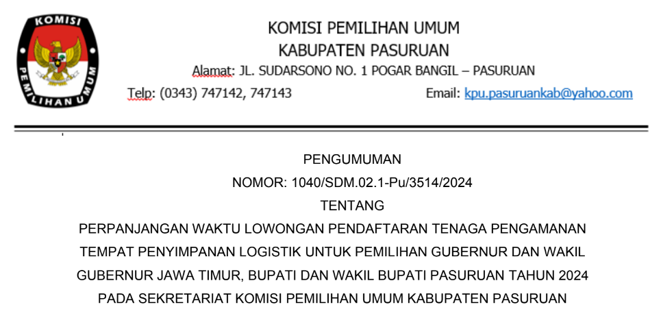 PERPANJANGAN WAKTU LOWONGAN PENDAFTARAN TENAGA PENGAMANAN TEMPAT PENYIMPANAN LOGISTIK UNTUK PEMILIHAN GUBERNUR DAN WAKIL GUBERNUR JAWA TIMUR, BUPATI DAN WAKIL BUPATI PASURUAN TAHUN 2024 PADA SEKRETARIAT KOMISI PEMILIHAN UMUM KABUPATEN PASURUAN