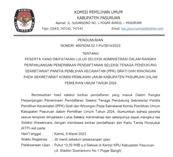 Pengumuman! Peserta Lulus Seleksi Administrasi Dalam Rangka Perpanjangan Penerimaan Pendaftaran Seleksi Tenaga Pendukung PPK Grati dan Winongan