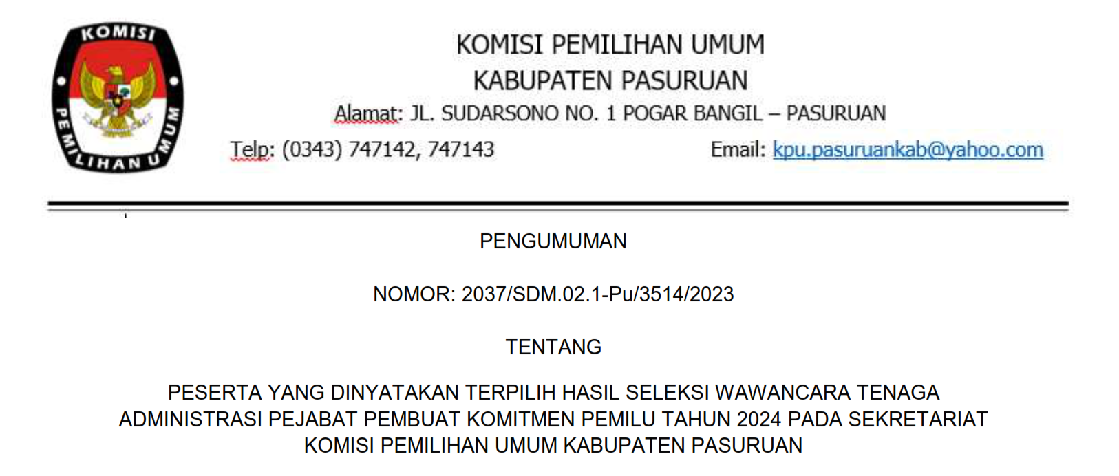 Pengumuman Peserta yang dinyatakan terpilih Hasil Seleksi Wawancara Tenaga Administrasi Pejabat Pembuat Komitmen Pemilu Tahun 2024 pada Sekretariat Komisi Pemilihan Umum (KPU) Kabupaten Pasuruan