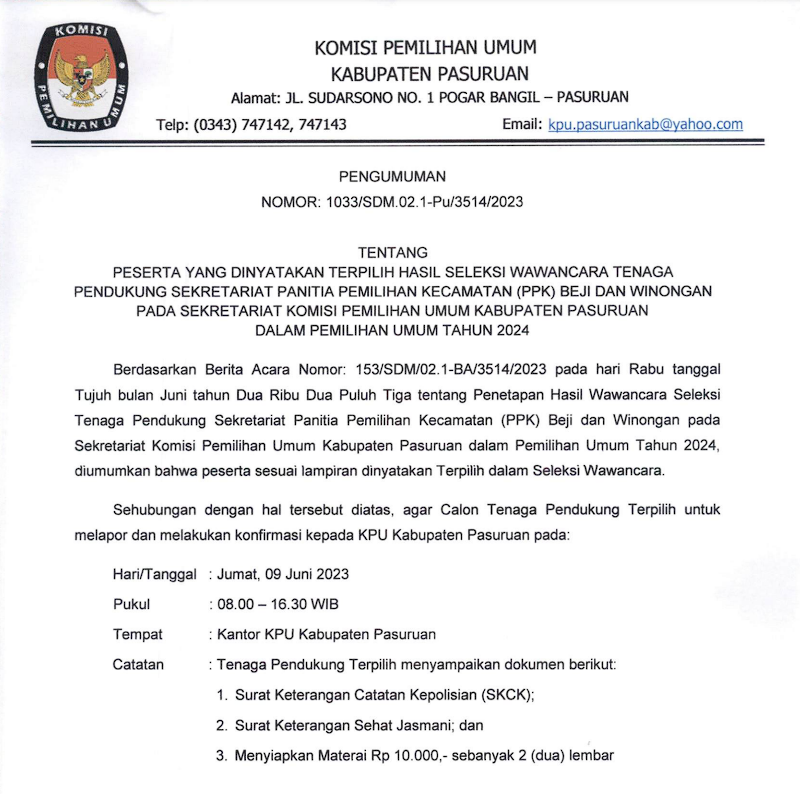 Pengumuman Peserta yang dinyatakan terpilih Hasil Seleksi Wawancara Tenaga Pendukung Sekretariat Panitia Pemilihan Kecamatan (PPK) Beji dan Winongan pada Sekretariat Komisi Pemilihan Umum Kabupaten Pasuruan dalam Pemilihan Umum Tahun 2024