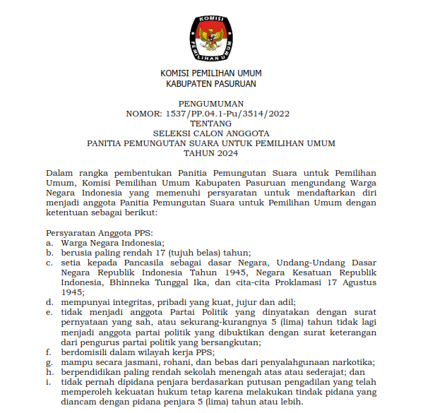 Seleksi Calon Anggota Panitia Pemungutan Suara Untuk Pemilihan Umum Tahun 2024 sesuai Pengumuman Ketua KPU Kabupaten Pasuruan Nomor 1537/PP.04.1-Pu/3514/2022 Tanggal 18 Desember 2022: