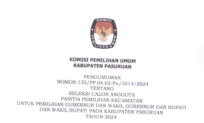 Pengumuman Seleksi Calon Anggota Panitia Pemilihan Kecamatan (PPK) untuk Pemilihan Gubernur dan Wakil Gubernur dan Bupati dan Wakil Bupati pada Kabupaten Pasuruan Tahun 2024