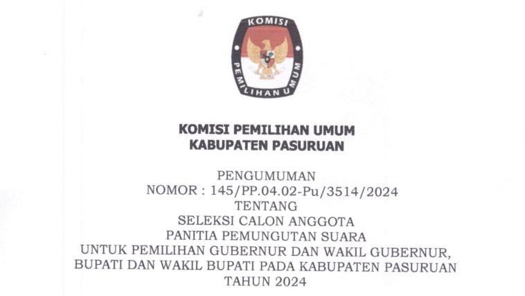 Pengumuman Seleksi Calon Anggota Panitia Pemungutan Suara (PPS) untuk Pemilihan Gubernur dan Wakil Gubernur, Bupati dan Wakil Bupati pada Kabupaten Pasuruan Tahun 2024
