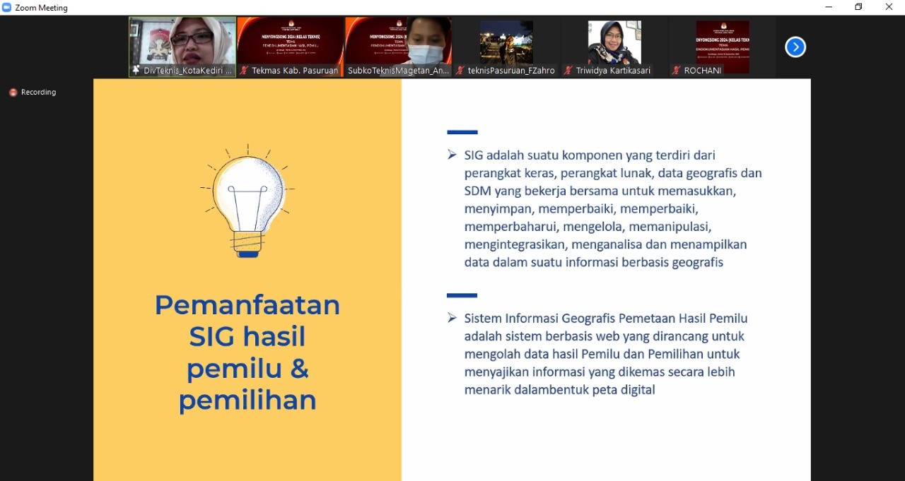 Pasuruan, kab-pasuruan.kpu.go.id – Kamis (16/09/2021) memasuki sesi ketujuh belas ruang diskusi Kelas Teknis yang diselenggarakan secara virtual oleh Komisi Pemilihan Umum (KPU) Provinsi Jawa Timur. Pada ruang kelas teknis kali ini membahas terkait pendokumentasian hasil Pemilu edisi kedua. Peserta terdiri dari Divisi Teknis Penyelenggara dan Sub Koordinator Teknis dan Hupmas KPU Provinsi Jawa Timur dan KPU Kabupaten/Kota se - Jawa Timur, juga dari divisi lain yang turut berpartisipasi dalam ruang diskusi tersebut.