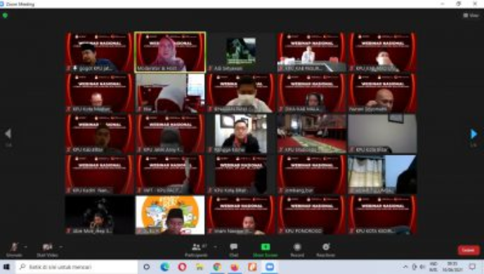 Pasuruan, kab-pasuruan.kpu.go.id – Kamis(10/06/2021) Komisi Pemilihan Umum (KPU) Kabupaten Pasuruan mengikuti webinar nasional yang diselenggarakan KPU Kota Blitar. Acara webinar yang dibuka pukul 10.00 WIB, diikuti oleh 38 KPU Kabupaten/Kota di Jawa Timur, juga dapat diikuti secara live streaming melalui akun youtube.