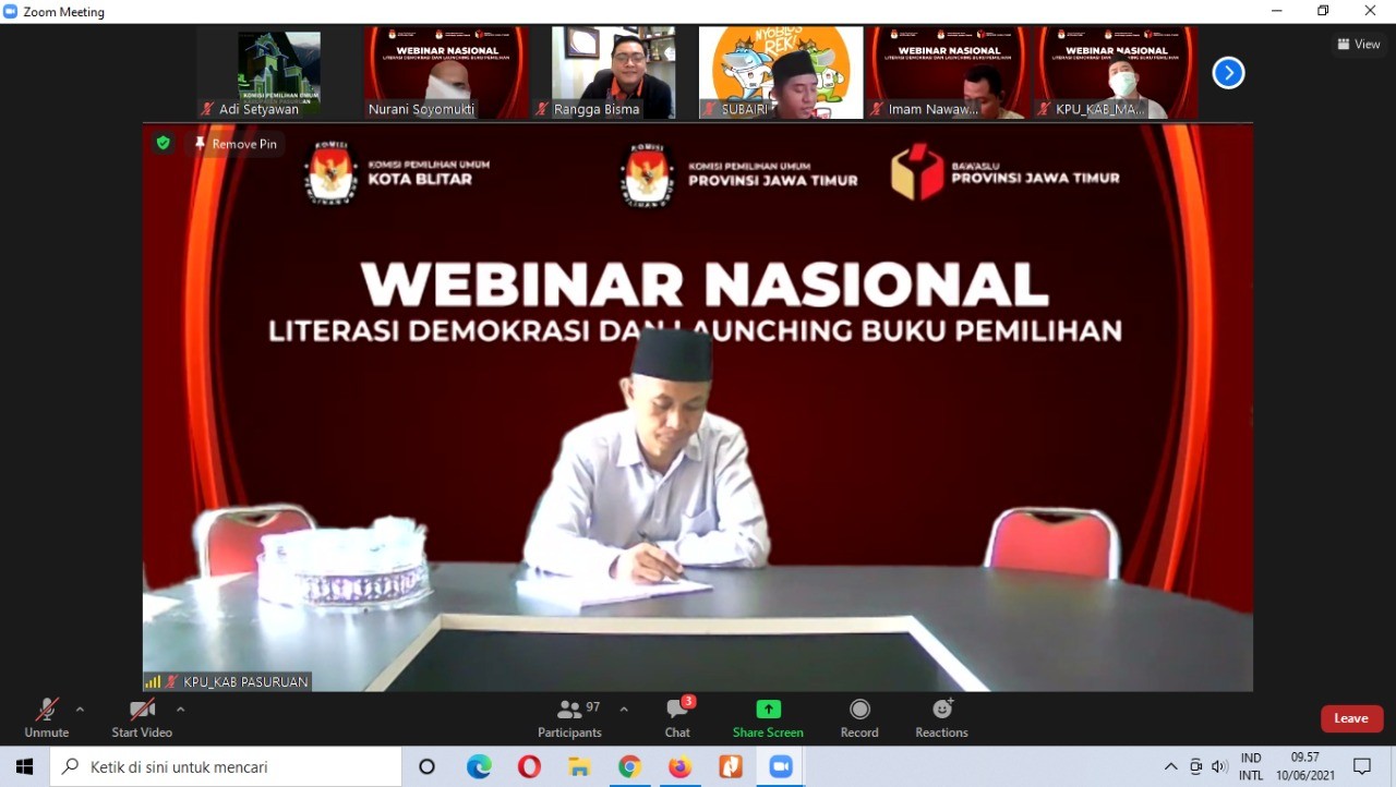 Webinar Nasional bertajuk “Literasi Demokrasi dan Launching Buku Pemilihan” menghadirkan 4(empat) narasumber, yang terdiri Divisi Sosdiklih, Parmas dan SDM KPU Kabupaten Trenggalek, Nurani Soyomukti dengan materi “Perkembangan Literasi Demokrasi di Indonesia”, kemudian materi oleh Divisi Sosdiklih, Parmas dan SDM KPU Kota Surabaya, Subairi, ”Dokumentasi Program Sosdiklih sebagai Sumber Literasi”.