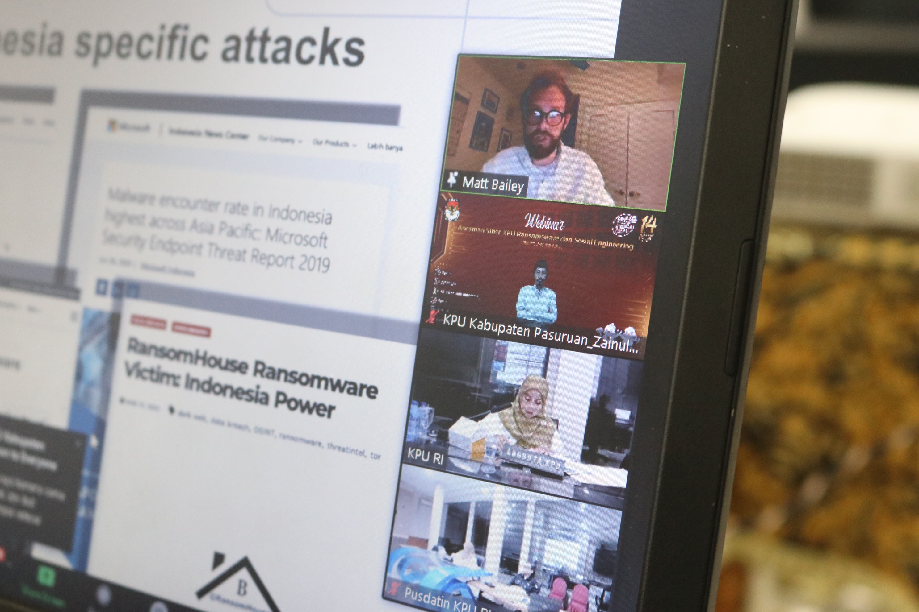 Antisipasi serangan Ransomware dan Social Engineering Komisi Pemilihan Umum (KPU) adakan Webinar pada Rabu, (2/8/2023) melalui Zoom Meeting dengan dihadiri oleh Kepala Pusat Data dan Informasi (Kapusdatin) KPU Republik Indonesia (RI) Nur Wakit Aliyusron serta mengundang Narasumber dari Universitas Indonesia (UI), prof. yudho giri sucahyo, Narasumber dari Senior Global Advisor For Ciber and Information Integrity, International Foundation for Electoral Systems (IFES) Matt Bailey.