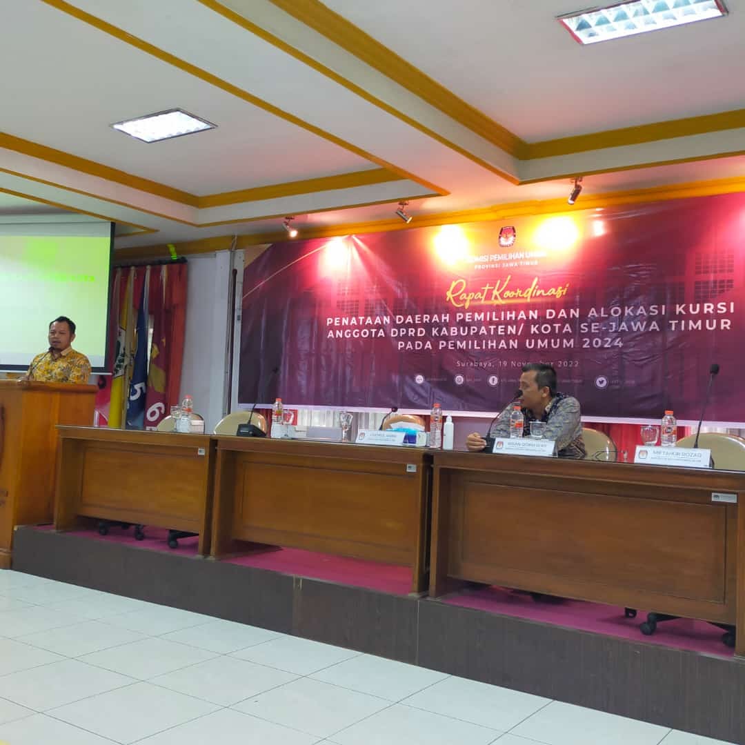 Surabaya - https://kab-pasuruan.kpu.go.id. Komisi Pemilihan Umum Kabupaten Pasuruan dalam rangka mempersiapkan penyusunan rancangan penataan daerah pemilihan (Dapil) dan alokasi kursi anggota DPRD Kabupaten/Kota untuk Pemilu 2024, menghadiri Rapat Koordinasi (Rakor) Penataan Daerah Pemilihan ( Dapil ) dan Alokasi Kursi Anggota DPRD Kabupaten / Kota se-Jawa Timur yang diselenggarakan oleh KPU Jatim pada Sabtu, 19 November 2022 di Aula Lantai 2 KPU Provinsi Jawa Timur, Jl. Raya Tenggilis No. 1-3 Surabaya.