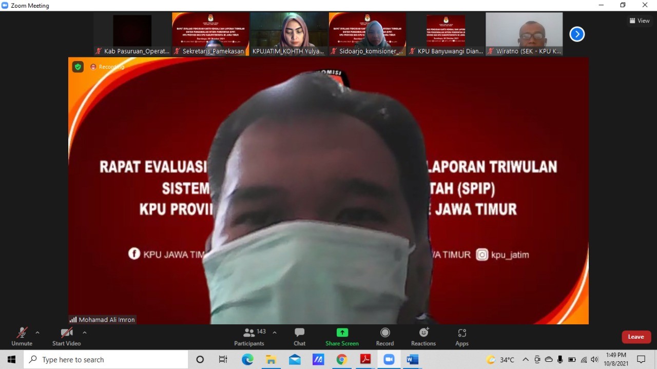 KPU Provinsi Jawa Timur mengadakan Rapat Evaluasi Pengisian Kartu Kendali dan Laporan Triwulan SPIP KPU Kabupaten/Kota se-Jawa Timur dalam rangka peningkatan pemahaman dalam pengisian dan pelaporan Kartu Kendali SPIP secara daring melalui aplikasi zoom meeting. Peserta kegiatan berasal dari 38 KPU Kabupaten/Kota se-Jawa Timur, terdiri dari Divisi Hukum dan Pengawasan, Sekretaris KPU, Sub Koordinator Hukum serta Operator/Satgas SPIP.