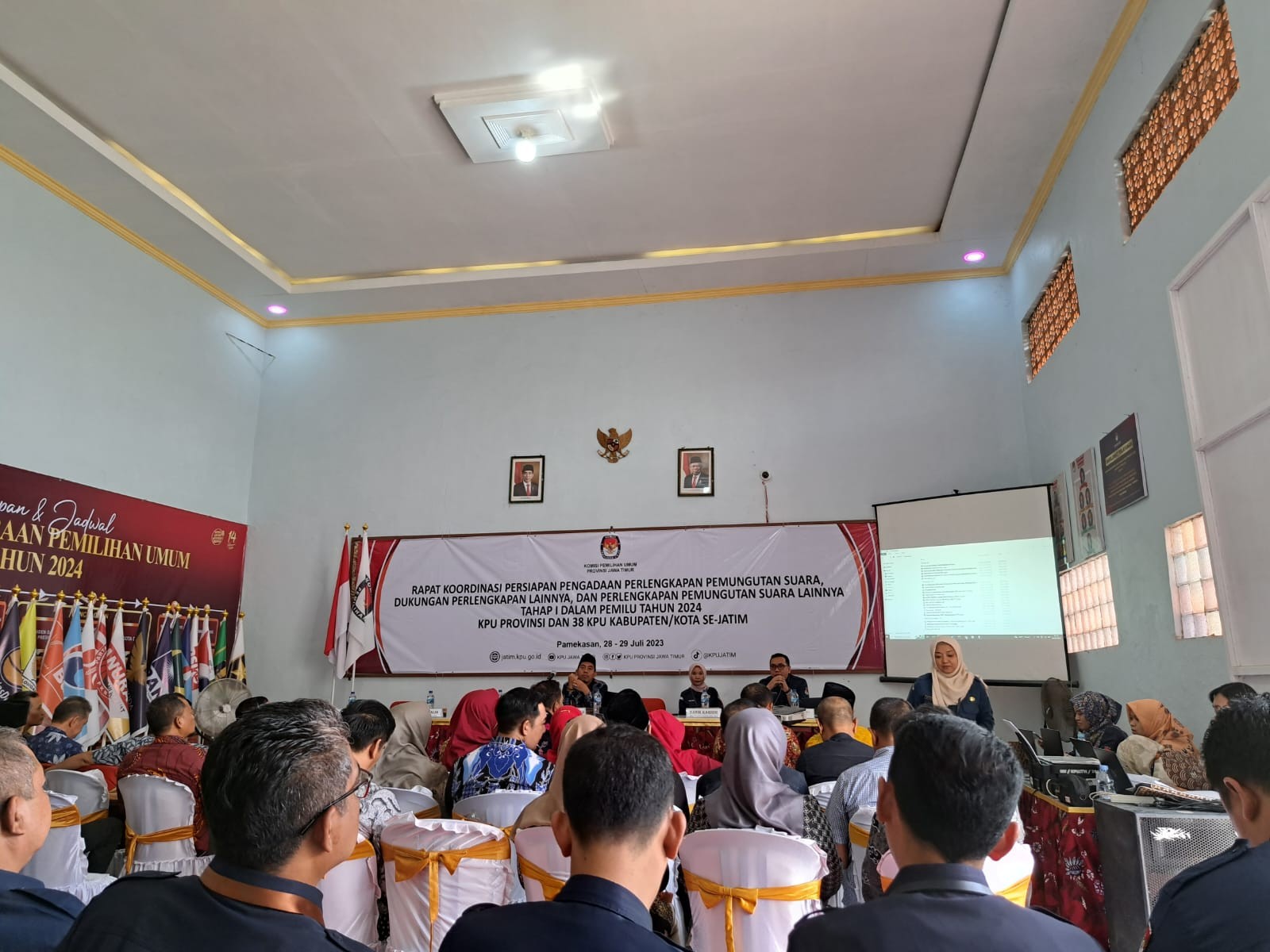Pasuruan, Jum'at (28/07/2023) Komisi Pemilihan Umum (KPU) Kabupaten Pasuruan hadir dalam kegiatan Rapat Koordinasi Persiapan Pengadaan Perlengkapan Pemungutan Suara, Dukungan Perlengkapan Lainnya dan Perlengkapan Pemungutan Suara Lainnya Tahap I Dalam Pemilu Tahun 2024 yang diselenggarakan pada 28 hingga 29 Juli 2023 di Kabupaten Pamekasan.