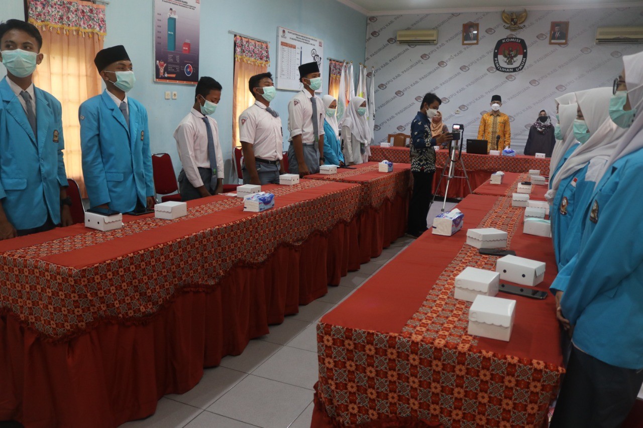 Peserta dan Pendamping MA Hasan Munadi Beji tiba di kantor KPU Kabupaten Pasuruan pukul 08.40 WIB. Seluruh peserta, panitia menerapkan protokol kesehatan seperti mencuci tangan, cek suhu, jaga jarak dan menggunakan masker yang telah disiapkan oleh seluruh Panitia KPU Kabupaten Pasuruan mulai dari staf, kasubbag dan sekretaris.