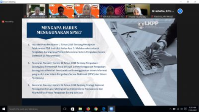 Dimulai pukul 09.00 WIB hingga 12.30 WIB, kegiatan diadakan secara daring melalui zoom meeting, diikuti oleh Pejabat Pembuat Komitmen (PPK) Sekretariat KPU Provinsi/KIP Aceh dan KPU/Komisi Independen Kabupaten/Kota seluruh Indonesia.