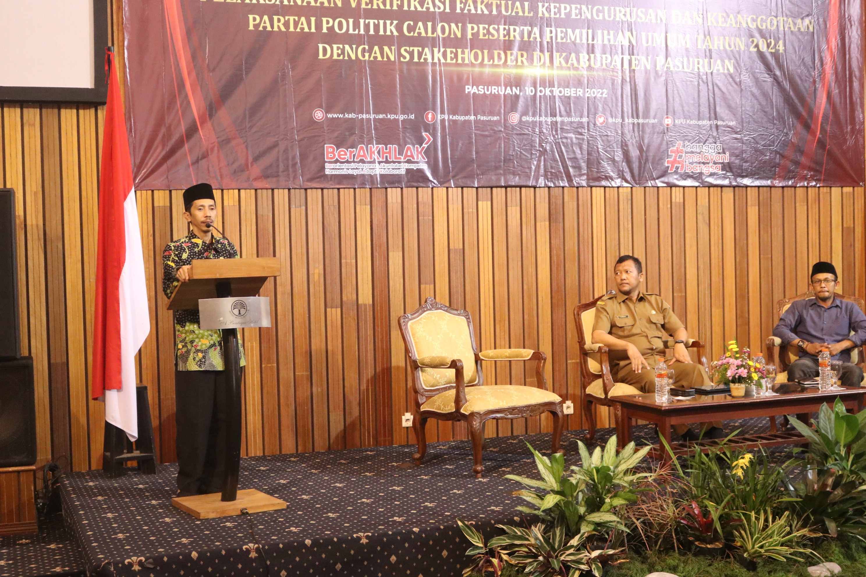 Prigen- https://kab-pasuruan.kpu.go.id. Komisi Pemilihan Umum Kabupaten Pasuruan, Senin (10-10-2022) menyelenggarakan Rapat Koordinasi (Rakor) dan Sosialisasi Pelaksanaan Verifikasi Faktual Kepengurusan dan Keanggotaan Partai Politik Calon Peserta Pemilu 2024 dengan Stakeholder di Hotel Royal Senyiur, Jl. Putuk Truno, No 208, Prigen. Kegiatan Rakor dimulai pada 13.00 WIB, dihadiri oleh Ketua KPU Zainul Faizin beserta anggota, Anggota Bawaslu Kabupaten Pasuruan, M. Misbahul Munir, Sekretaris Daerah (Sekda) Kabupaten Pasuruan, Yudha Triwidya Sasongko, Kasi Intel Kejaksaaan Negeri (Kejari) Kabupaten Pasuruan, Jemmy Sandra,Kepala Bakesbangpol Pasuruan, Eddy Supriyanto, Dispendukcapil, Polres Pasuruan dan Pasuruan Kota serta 24 Camat di kabupaten Pasuruan.