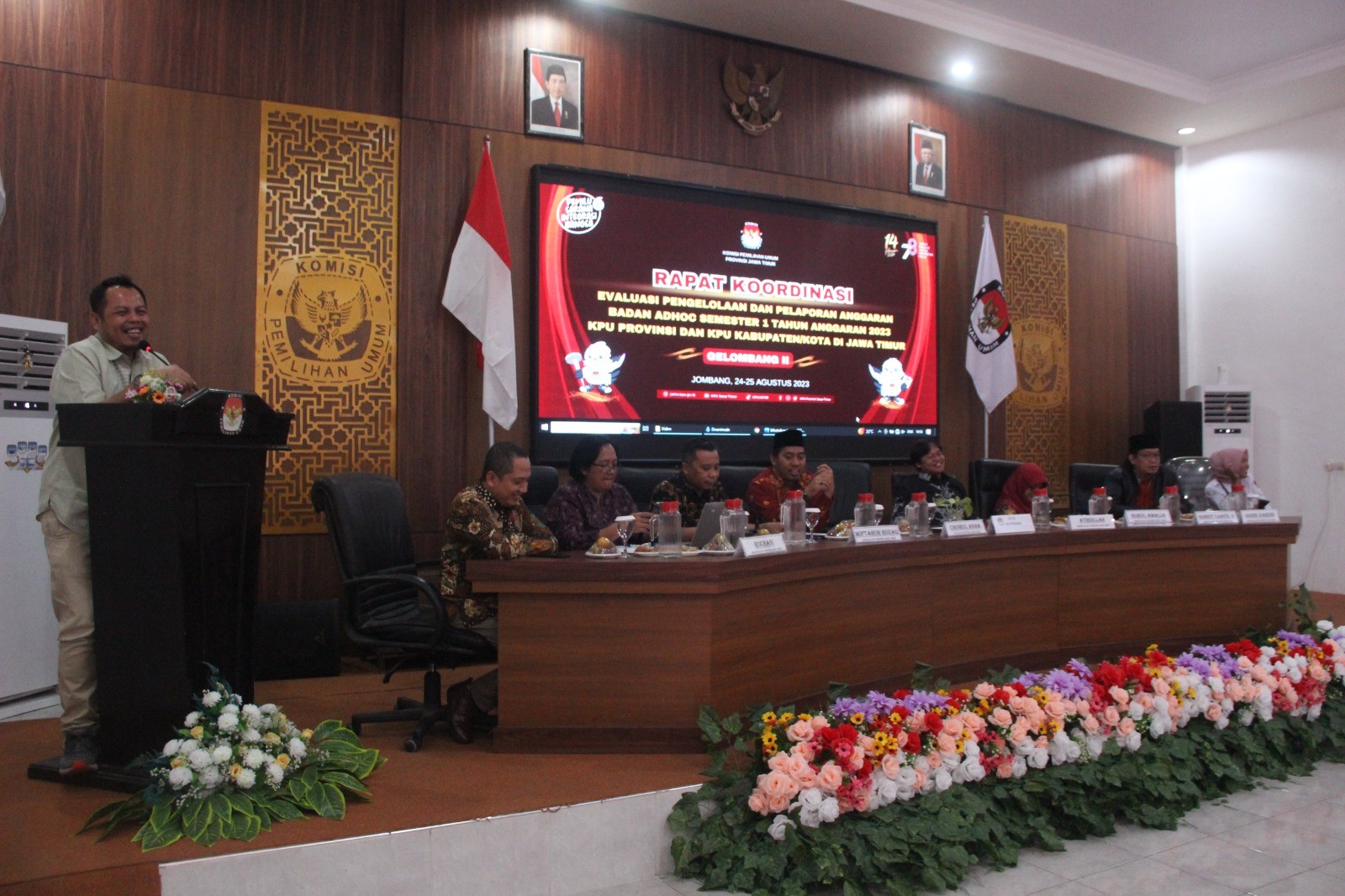 Komisi Pemilihan Umum (KPU) Provinsi Jawa Timur menggelar Rapat Koordinasi Evaluasi Pengelolaan dan Pelaporan Anggaran Badan Adhoc Semester 1 Tahun Anggaran 2023. Usai Gelombang Pertama digelar di Kantor KPU Kabupaten Pasuruan, kini gelombang kedua digelar di Kantor KPU Kabupaten Jombang selama dua hari pada tanggal 24-25 Agustus 2023.