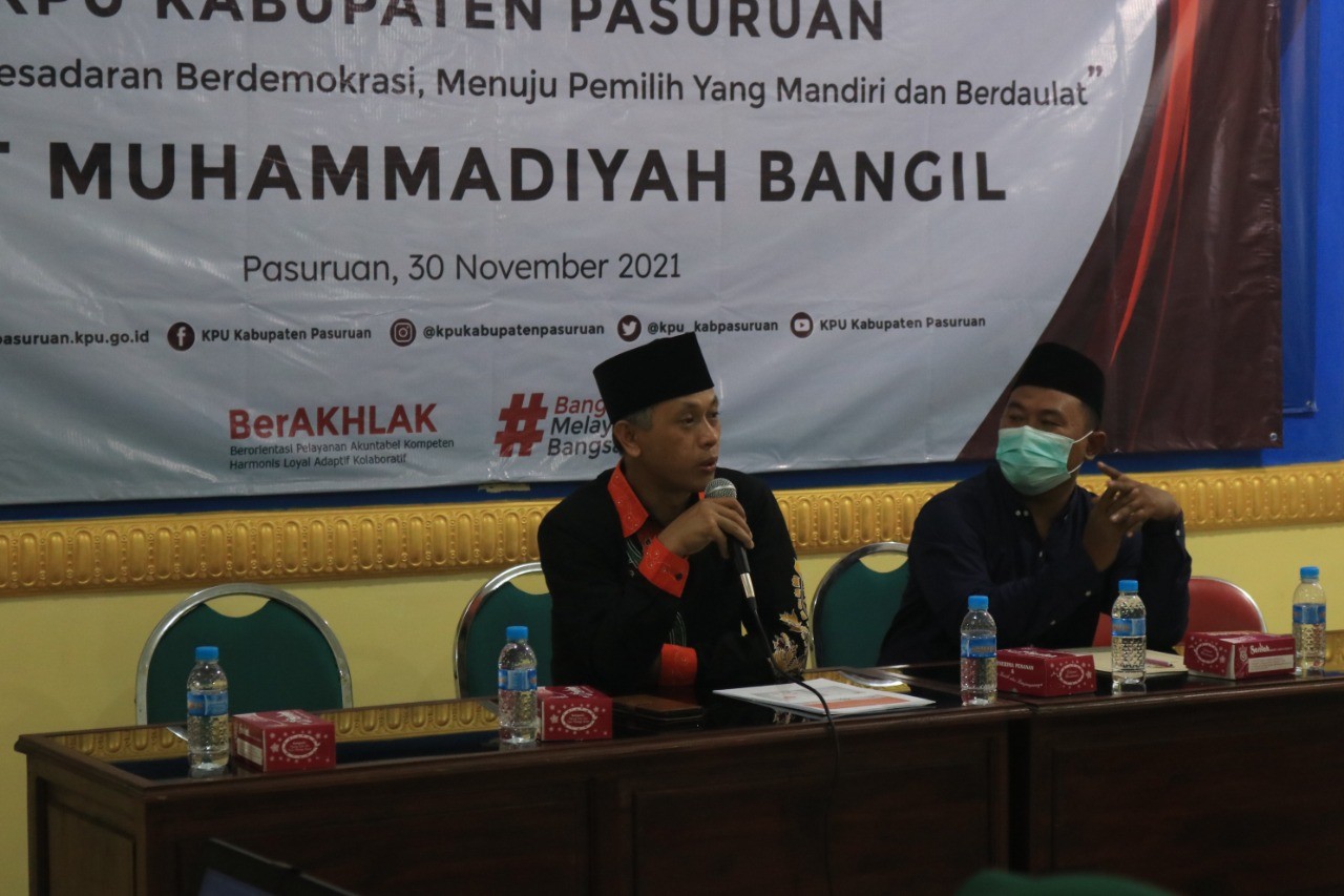Pasuruan, kab-pasuruan.kpu.go.id- Selasa (30/11/2021) dalam upaya meningkatkan kesadaran berdemokrasi, partisipasi dan literasi politik bagi pemilih pemula/pemilih muda dalam penyelenggaraan Pemilu dan Pemilihan Tahun 2024, Komisi Pemilihan Umum Kabupaten Pasuruan melaksanakan kegiatan Pendidikan Pemilih kepada para mahasiswa STIT (Sekolah Tinggi Ilmu Tarbiyah) Muhammadiyah Bangil. Tema yang diusung dalam acara kegiatan pendidikan pemilih kali ini yaitu “Membangun Kesadaran Berdemokrasi, Menuju Pemilih Mandiri dan Berdaulat”.