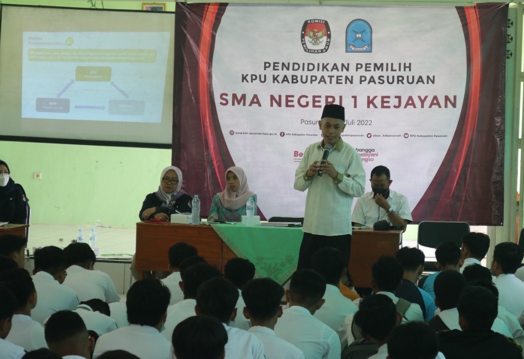 Usaha untuk meningkatkan partisipasi pemilih pada Pemilu Serentak Tahun 2024 terus dilakukan oleh KPU Kabupaten Pasuruan dengan cara mengedukasi para Pelajar SMA Negeri Kejayan agar menjadi pemilih cerdas dan memiliki pengetahuan yang luas tentang kepemiluan.