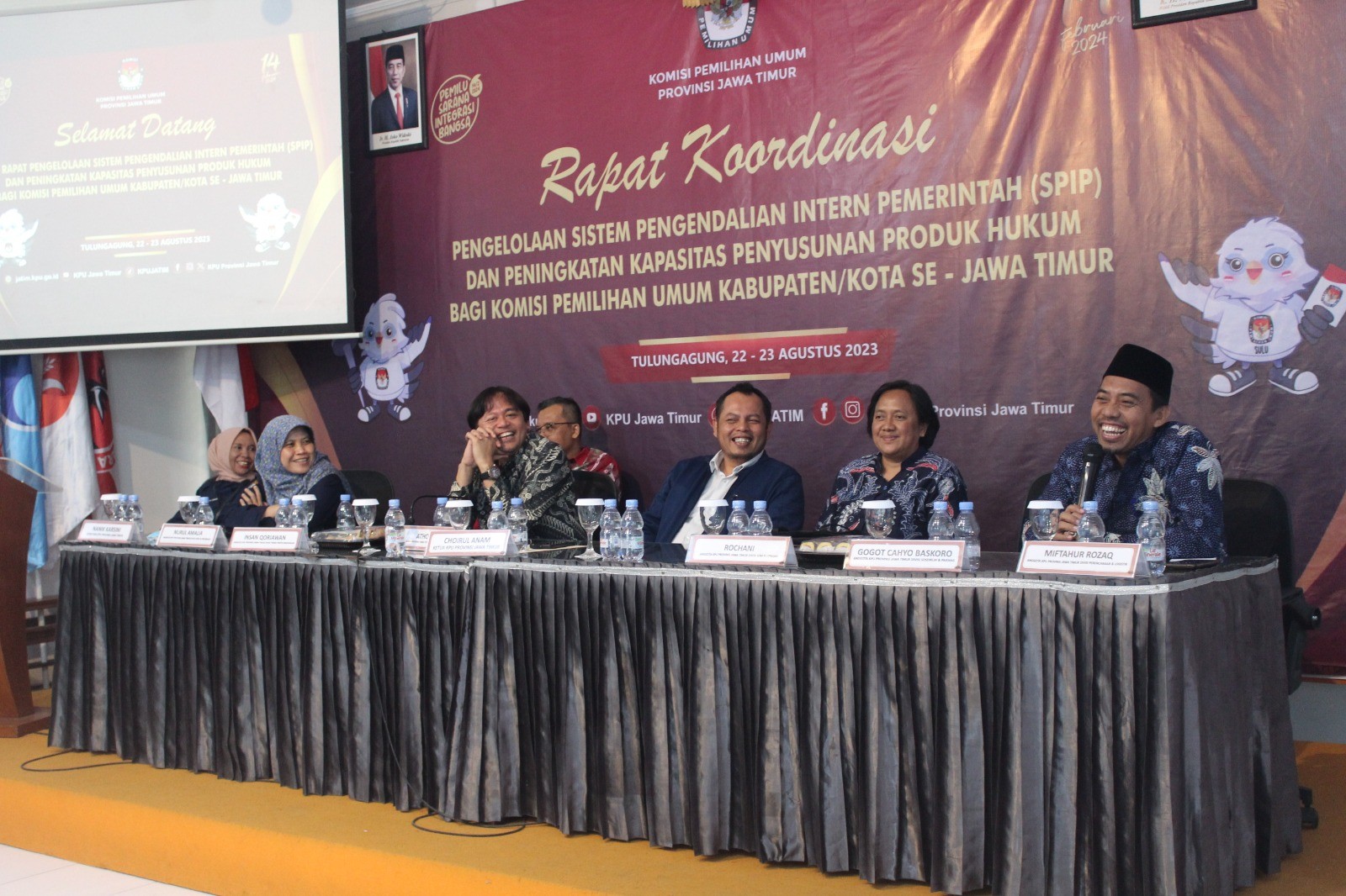 Komisi Pemilihan Umum (KPU) Kabupaten Pasuruan turut hadir dalam Rapat Koordinasi Pengelolaan Sistem Pengendalian Intern Pemerintah (SPIP) dan Peningkatan Kapasitas Penyusunan Produk Hukum bagi KPU Kabupaten/Kota Se-Jawa Timur. Selasa-Rabu, (22-23/08/2023). Bertempat di KPU Kabupaten Tulungagung.