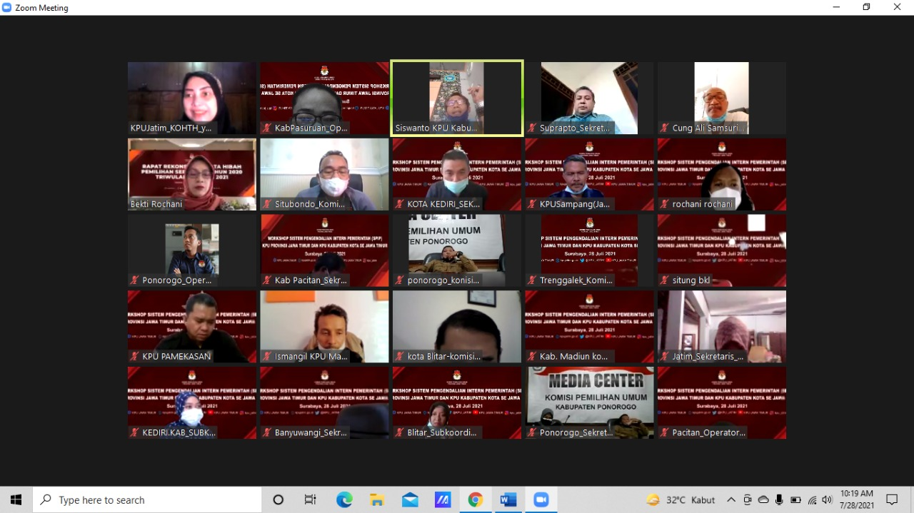 Pasuruan, kab-pasuruan.kpu.go.id – Rabu (28/07/2021) dalam rangka peningkatan pemahaman atas penyelenggaraan Sistem Pengendalian Intern Pemerintah (SPIP), Komisi Pemilihan Umum (KPU) Provinsi Jawa Timur mengadakan workshop bersama KPU Kabupaten/Kota se-Jawa Timur yang dilaksanakan secara daring, dalam 4 (empat) sesi, dimulai tanggal 28 dan 30 Juli, dilanjutkan 4 dan 6 Agustus 2021 dengan peserta dari KPU Kabupaten/Kota sebagaimana terlampir dalam surat KPU Provinsi Jawa Timur Nomor 358/HJK.05-SD/35/Prov/VII/2021 perihal Workshop Sistem Pengendalian Intern Pemerintah (SPIP).
