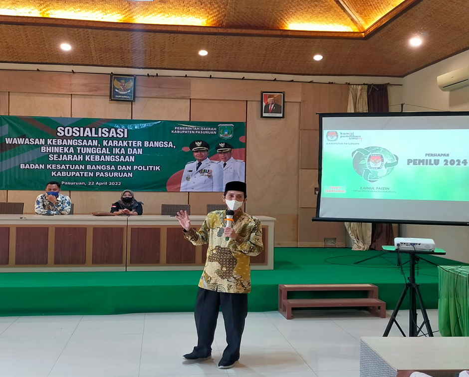 Pasuruan, kab-pasuruan.kpu.go.id - Jumat (22-04-2022), dalam rangka Peningkatan Wawasan Kebangsaan, Karakter Bangsa, Bhinneka Tunggal Ika dan Sejarah Kebangsaan, Bakesbangpol Kabupaten Pasuruan menggandeng KPU sebagai salah satu narasumbernya. Bertempat di Ruang Pertemuan RM Kebon Pring acara sosialisasi dengan peserta perwakilan dari anggota partai politik non perlemen.