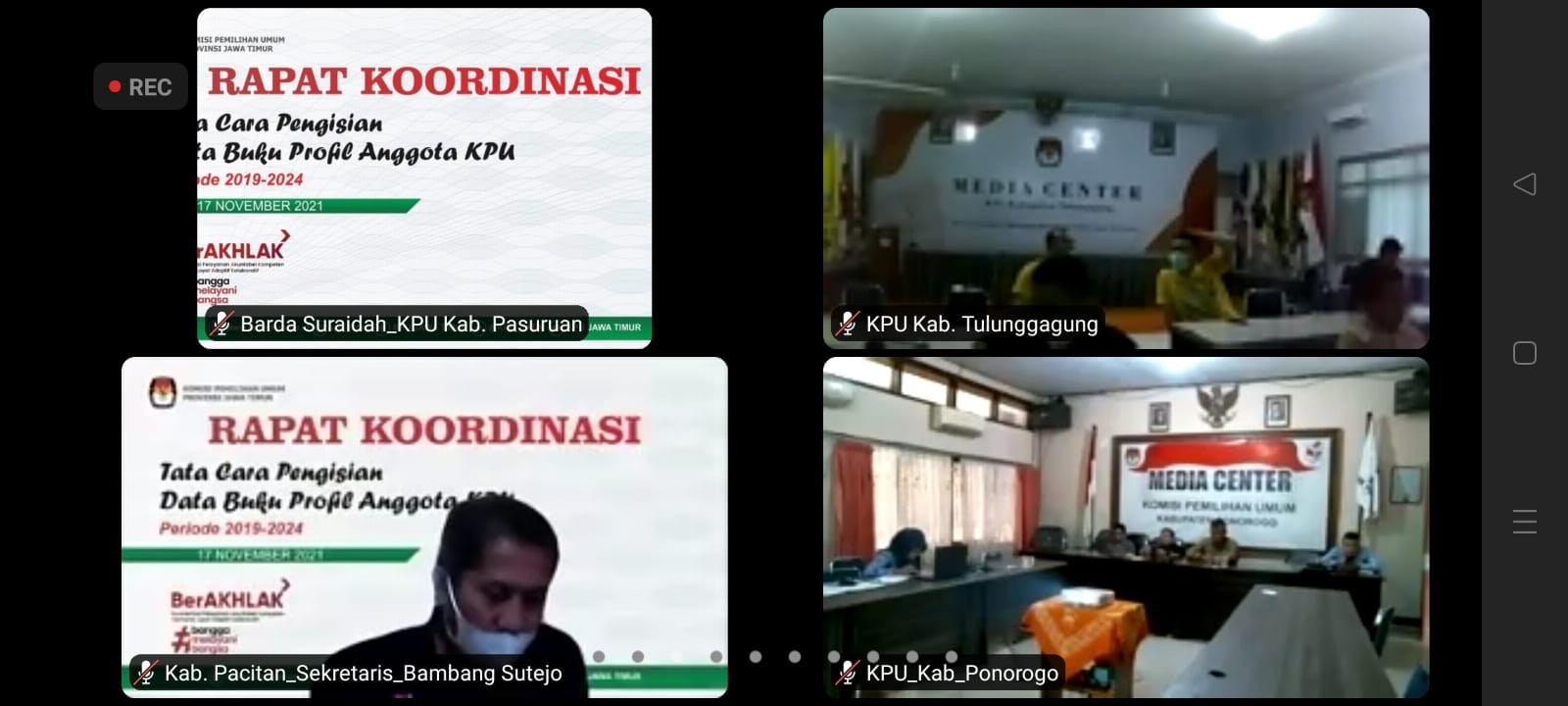 Pasuruan, kab-pasuruankpu.go.id - Rabu (17/11/2021) KPU Provinsi Jawa Timur menggelar Rapat Koordinasi Tata Cara Pengisian Data Buku Profil Anggota KPU Provinsi dan KPU Kabupaten/Kota. Acara yang dilaksanakan secara daring via zoom meeting tersebut dihadiri Ketua dan Anggota KPU, Sekretaris dan Subkoordinator/Kepala Subbagian Keuangan, Umum dan Logistik KPU se-Jawa Timur sesuai Undangan Ketua KPU Provinsi Jawa Timur Nomor 106/SDM.13/35/2021 tanggal 16 November 2021.