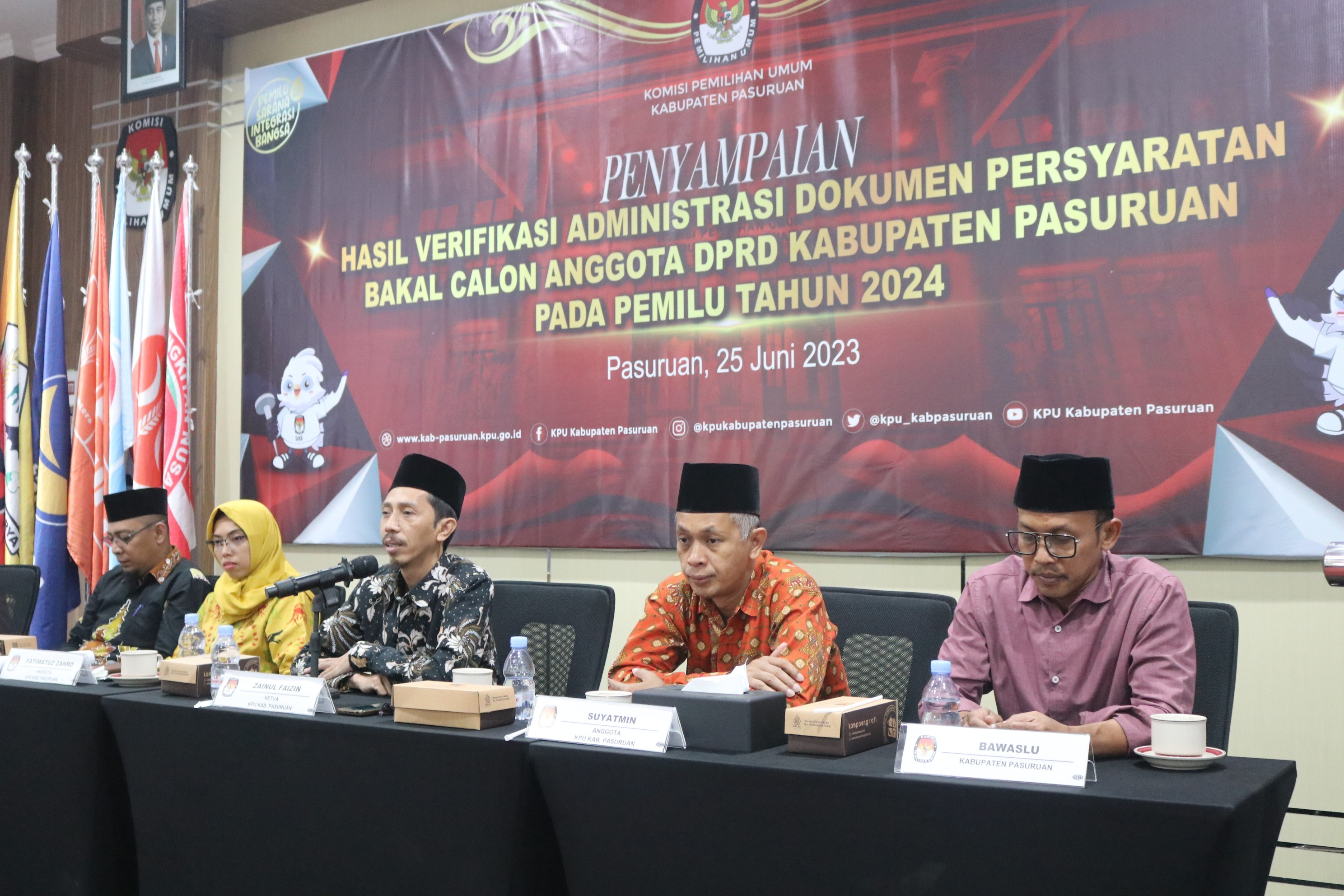 Setelah selesainya Proses Panjang Verifikasi Administrasi Dokumen Persyaratan Bakal Calon Anggota Dewan Perwakilan Rakyat Daerah (DPRD) Kabupaten Pasuruan yang telah di lakukan pada tanggal 15 Mei 2023 Hingga Berakhir pada tanggal 23 Juni 2023 kemarin. Kini saatnya Komisi Pemilian Umum (KPU) Kabupaten Pasuruan Menyampaikan Hasil dari proses Verifikasi tersebut yang dituangkan dalam bentuk Berita Acara pada Minggu, (25/06/2023) di Gedung Serbaguna KPU Kabupaten Pasuruan, Jl. Sudarsono No. 01 Pogar - Bangil Pasuruan.