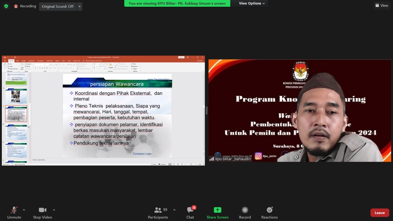 Hadir sebagai peserta Suyatmin selaku Divisi Sosdiklih, Parmas dan SDM, juga Barda Suraidah selaku Plt. Kasubbag Keuangan, Umum dan Logistik KPU Kabupaten Pasuruan mengikuti acara knowledge sharing hingga selesai pukul 11.05 WIB.